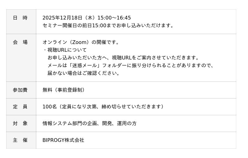 ご入力いただくお客さまの個人情報は、当社( BIPROGY株式会社 ) および 当社グループ企業 が、1)本セミナーに関する連絡・確認、2)当社グループの取り扱い製品・サービスに関する情報提供および 3)イベント・セミナーなどのご案内の目的で利用させていただきます。