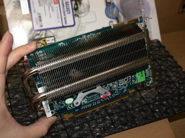 極太の2本のヒートパイプで接続されたカード裏面のアルミ製ヒートシンクは、ご覧のようにかなり巨大で厚みもある。隣接スロットや他パーツとの干渉には十分注意したい。主な仕様はコア/メモリクロックが600MHz/1400MHz。インターフェイスはデュアルDVI、TV-OUT(HDTV対応)という構成で、搭載メモリはDDR3 256MB。なおパッケージ“Native CrossFire”用ケーブル同梱という旨が記載されているが、販売を確認したショップの製品では1本も確認できなかった。価格はアークで2万980円、T-ZONE.PC DIY SHOPで2万1480円だ。