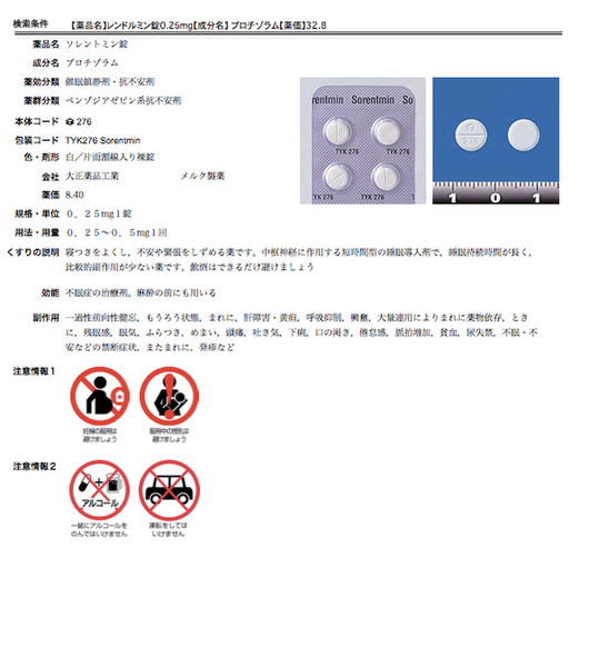 睡眠誘導剤「レンドルミンD錠」から検索した結果、もっとも安価だった「ソレントミン錠」。このジェネリック薬品を探すのにかかる手間はわずか3クリック。検索結果の一覧などから「印刷」ボタンをクリックすれば、病院に持参する資料を即座に作れる