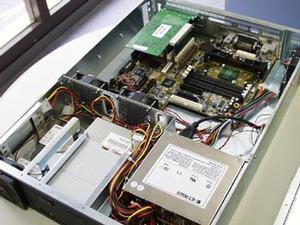 | 全体。ATXのマザーボードがそのまま入っているのが分かる。全体的にケースが縦長になっており、容積を稼いでいる。採用しているのは、今のところASUSの「P2B-LS」 |