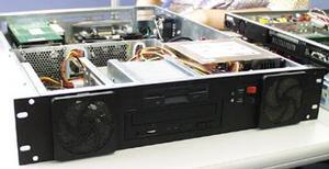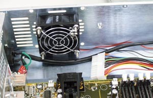 | 電子部品に使われる素子は熱に弱い。部品の温度が3~5度高いだけで、寿命は半分になってしまうといわれている。Trusシリーズでは、空気の流れも考慮に入れられている。Trus-2に取り付けられたファンは5基。ただ単に熱源に風を当てるだけではなく、吸気口、排気口を考えてファンが取り付けられる。空気の流れを“押し”たり“引っ張”ったりしながら、熱が淀まないようになっている |
