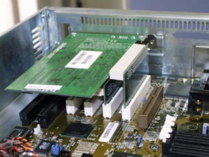 | 2Uの高さながらPCIカードを使用できるヒミツが、このL字型の中継コネクタだ |