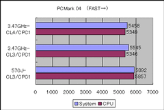 Pentium 4-570Jがひときわ落ち込んでいるのが目に付くが、FSB800MHzのPentium 4では毎秒4.8GB程度が普通なので、ほぼ5GBまで迫ったのはむしろ快挙と言える。800MHzのFSBでは理論上限性能は毎秒6.4GB。メモリとCPUの間にチップセットを挟んでいるオーバーヘッドを考えると、実効性能としてはこのあたりが限界ということだ。これに対してFSB1066MHz、理論上限8.5GBのP4-3.46GHzはすばらしい。しかも、12-4-4-4設定に比べ、8-3-3-3設定にすると毎秒200MBの性能向上を果たし、毎秒5.79GBという高性能をマークした。これはメモリコントローラをCPUに内蔵したAthlon 64シリーズにあと200MBまで迫るものだ。