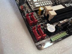 | 同社によるとチップセットに“i945X Express”搭載したキューブ型ベアボーンPC用のマザーボード。型番は隠されており判別は不可能だった | Serial ATAコネクタ×4を搭載する |