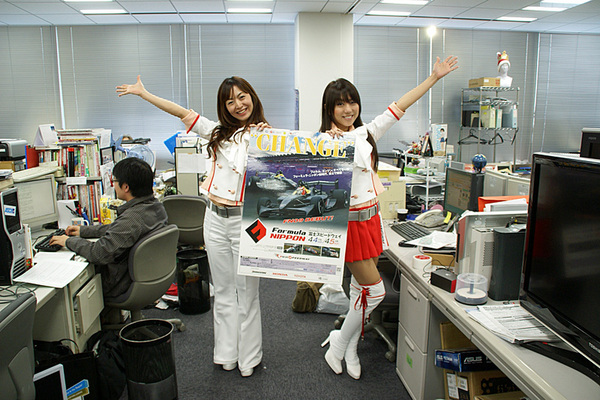 日本のフォーミュラカーレース「フォーミュラニッポン」(以下、Fポン)の2009シーズンが4月4日に開幕となる。それを記念して、富士スピードウェイのイメージガール「クレインズ」の布施曜子ちゃんと秋葉ミキちゃんが、ASCII.jp編集部にPRをしにきてくれたぞ!