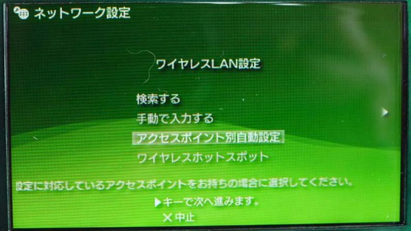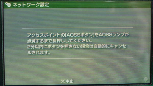 ここで、どこでもWi-Fiの、AOSSボタンをAOSSランプが点滅するまで長押しする。あとは自動的に無線の接続設定に入るので、60~80秒間ほど待つだけだ。その間「しばらくお待ち下さい」「アクセスポイントの準備が完了するまで10秒ほどお待ち下さい」など、PSPにメッセージが表示される。以下の図が表示されたらアクセス完了。右カーソルボタンを押そう。