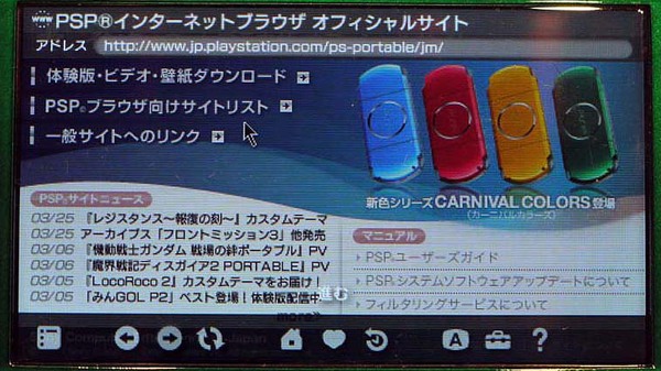 試みに、ウィルコムFANサイトのページを表示させてみた(下図左)。通信速度やPSP自体の処理性能の関係で、表示はやや待たされるが、いざというときにどこでもウェブブラウジングできる点には安心感がある。さまざまなネットワークのサービスをどこでも利用できるメリットも魅力的だ。