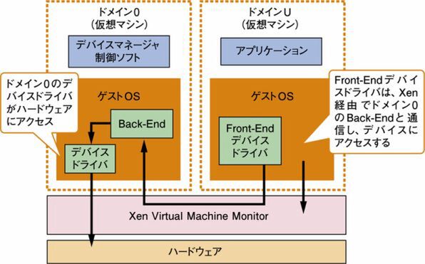 Xenでは仮想マシンを「ドメイン」と呼び、ドメイン0で実行されているゲストOSがハードウェアアクセスを行なう。それ以外のドメインをドメインUという。ドメインUには「Front-Endデバイスドライバ」が組み込まれており、Xenハイパーバイザ経由でドメイン0の「Back-Endモジュール」と通信してI/O処理を行なう。
