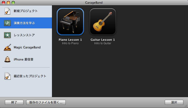 機材のセットアップが完了したら、早速、GarageBandでレッスンだ! GarageBand '09のレッスンには、「基本レッスン」と洋楽の有名アーティストによるレクチャーが受けられる「アーティストレッスン」がある。初めてピアノを弾いてみるなら、まずは無料の基本レッスンから始めよう。