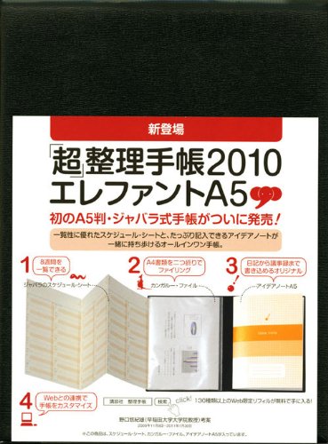 「超整理法」で有名な経済学者の野口悠紀夫氏が考案した手帳が「超整理手帳2010エレファント」。超整理手帳と言えば、8週間を一覧できるA4サイズの紙を綴じ込んだ細長い手帳で有名だ。「超整理手帳2010エレファント」はA5サイズ化することで、スケジュールに加えA5サイズのノートも同時に持ち歩けるように進化した手帳だ。
