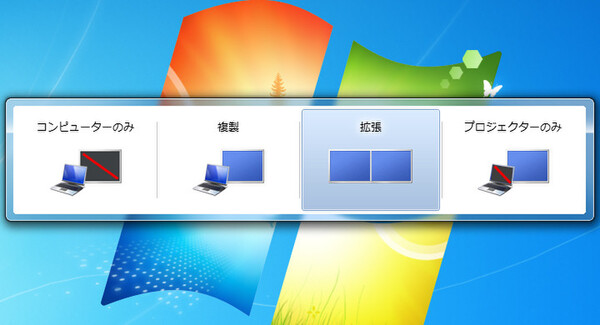 プロジェクターへ接続する方法を選択できる。ノート本体のみに表示するほかに、デスクトップの複製や拡張、プロジェクターのみが選べる。プレゼン時に手軽に出力を切り替えられるので、スマートに操作できる。