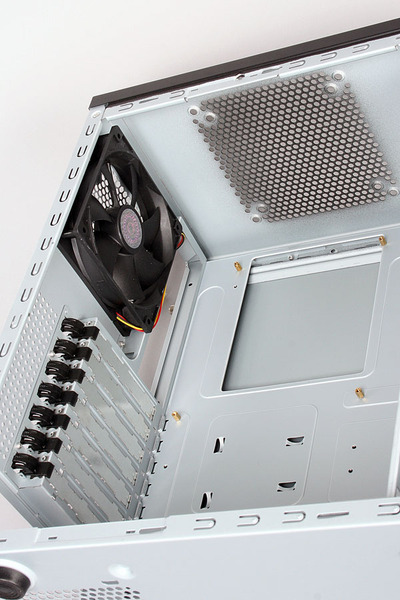 Centurion 5 IIのサイズは、20.2(W)×48.5(D)×44(H)cmで、重量は約7.5kgだ。材質はスチールだが、ベゼルにはアルミニウムやプラスチックが使われている。標準で搭載しているファンは、フロントファン(14cmファン)とリアファン(12cmファン)の2基だが、上面に1つと、左サイドパネルに2つのファンを追加できるので、最大5つのファンを搭載可能だ。拡張スロットは7つで、フタはドライバーなどの工具を使わずに着脱が可能なツールフリー仕様になっている。