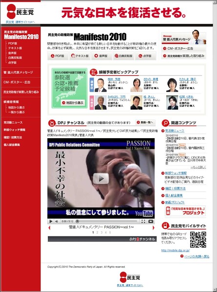 なお、YouTubeから引っ張ってきた動画をトップページの一等地に貼ることが政党公式サイトの流行(?)らしいのだが、結果的に最も目立っているのは動画中央の再生開始ボタン(しかも例外なく代表の顔に被さっている)という少々残念な状況となっている。