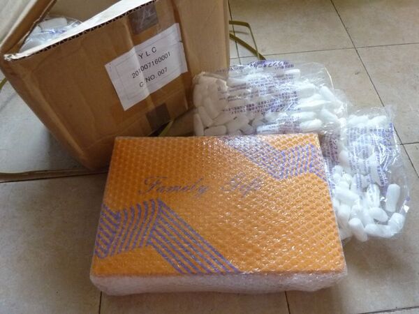 筆者の場合、購入ボタンを押してから15日後に突然それは届いた。確かに届いたが、エアパッキン、いわゆるプチプチに丁寧に包まれていた商品にも関わらず、箱自身は四方からの圧力により、ギフトセットとして渡すには失礼なほどの形状となっていた。