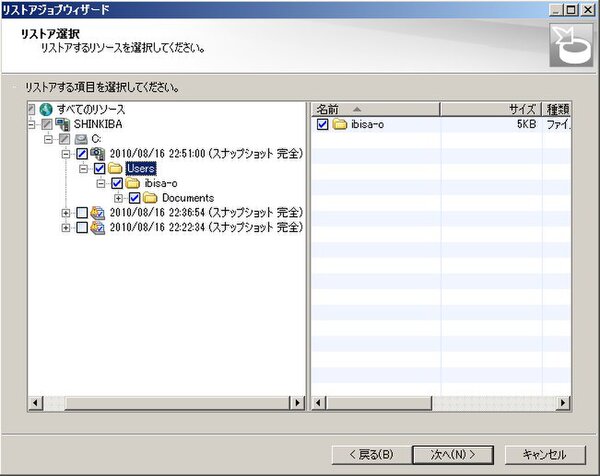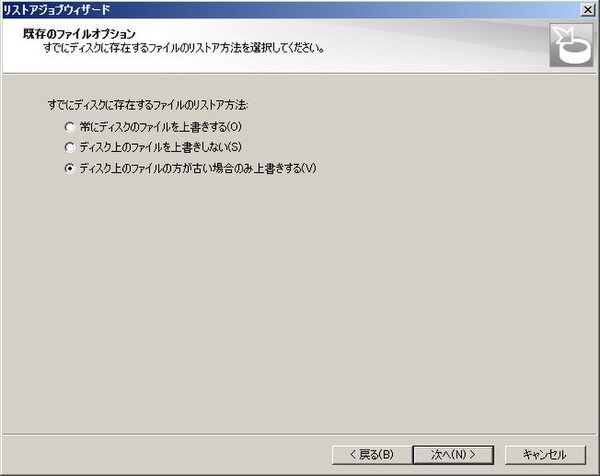 リストアの設定を行なうには管理コンソールの「ジョブ作成タスク」から「リストアジョブを作成する」をクリックする。ウィザードが起動するので、リストア項目を選択し、その後ログオンアカウントの有効性を試すリソースクレデンシャルを実行する。ログオンのテストが成功したら、リストアジョブ名前の登録、使用するデータソースの選択などを行なう。あとはすでにディスクに存在するファイルの扱いを選択すればよい。デフォルトでは「ディスク上のファイルの方が古い場合のみ上書きする」が選択されている。ウィザードの最後に「今すぐ実行する」を選択すると、すぐにリストアが開始される。実行し終えた結果はジョブモニターに表示される。