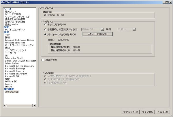 バックアップジョブウィザードでは、保護対象のデータ指定やリソースにアクセスするためのアカウント設定、バックアップ先のデバイス、バックアップ方式などを実行するに必要な項目のみ設定するが、より詳細な設定も可能だ。Symantec Backup Exec 2010では、「ジョブセットアップ」で対象のジョブを選択し、右クリックメニューからプロパティを開くと設定が変更できる。