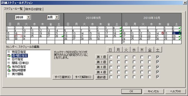 たとえば、ジョブのデフォルトでは「指定日時に1回だけ実行する」となっているが、第3回で説明したとおり、業務に影響を与えずに最新のバックアップをとるにはスケジュールの指定をきちんと行なう必要がある。これを変更するには、左側の「実行頻度」-「スケジュール」を選択し、「スケジュールに従って実行する」のチェックボックスをオンにし「スケジュールを設定」ボタンを押すとカレンダーが表示される。このカレンダーの日付をクリックし、特定日を指定したり、週や曜日を指定したり、あるいは実行間隔を指定することができる。たとえば、業務日は夜間に差分バックアップ、土日に週次で完全バックアップのように、複数のジョブを組み合わせるスケジュールはよく用いられる。また、関係部署のリクエストで、バックアップの実行を避けたい日時があるのであれば、「除外日の設定」タブで指定できる。商用ソフトウェアでは、こうしたスケジュール管理がやりやすいというメリットがある。