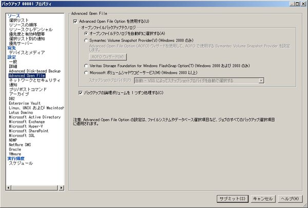 使用中のファイルのバックアップをとるオプション設定も重要だ。こういたオープンファイルのオプションを利用すると、バックアップをスキップしたり、ファイルが未使用になるまで待つといった事態を避けることができる。Symantec Backup Exec 2010では「Advanced Open File Option」という機能があり、複数のオープンファイルのバックアップ技術を自動的に選択してくれる。利用するには「Advanced Open File」を選択し、「Advanced Open File Optionを使用する」のチェックボックスをオンにすればよい。