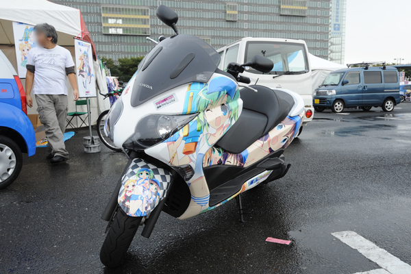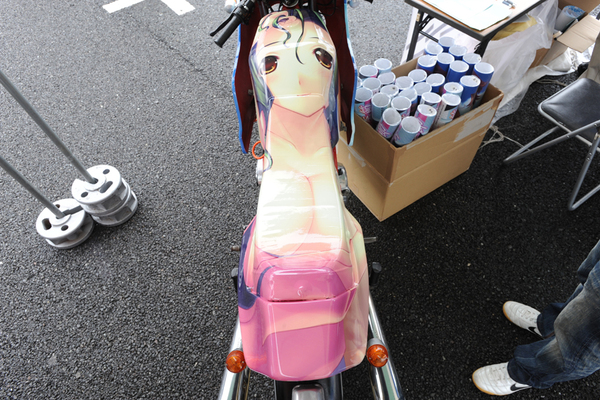 数多くのメーカーデモカーを手掛けるステッカー制作・施工会社の中央デザインのブースには、アージュの「君がいた季節」の痛単車が展示されていた。ちなみにシートは、やよいさんのように柔らかくはなかった。