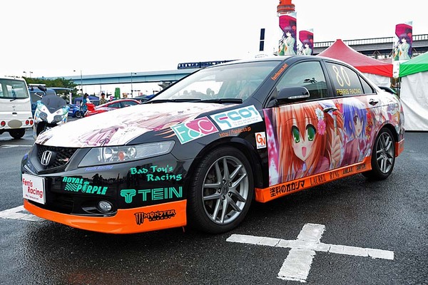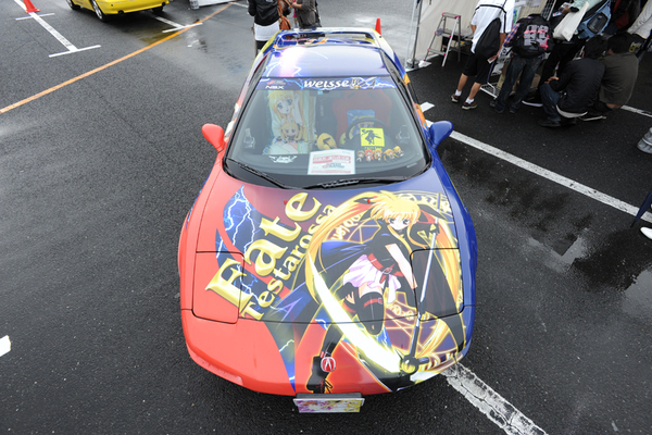 「魔法少女リリカルなのは」のフェイト・テスタロッサでフルラッピングされたアキュラ(ホンダのアメリカ向け高級ブランド) NSX。助手席に嫁が乗っているなど、外観だけではなく中もバッチリと痛仕様にされていた。