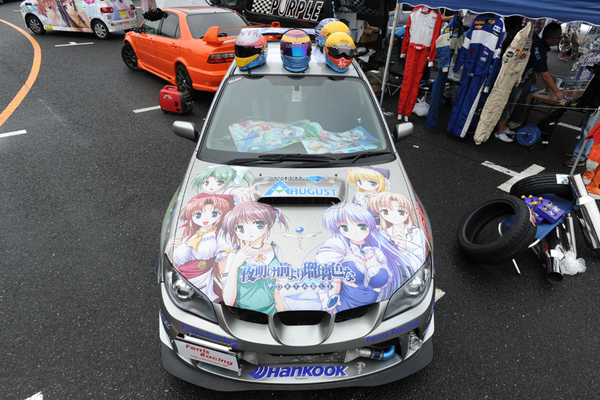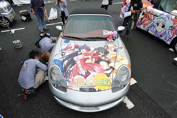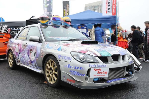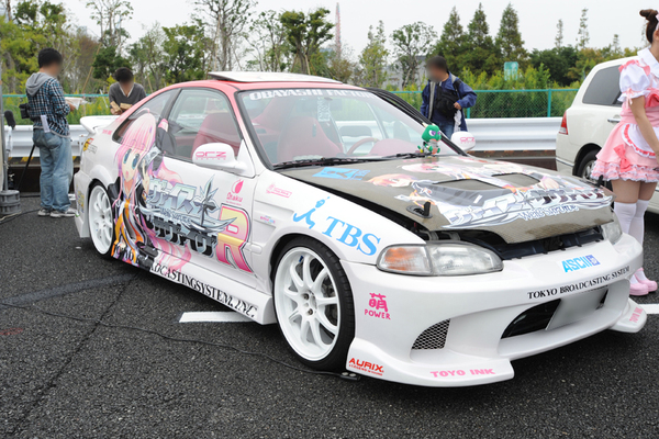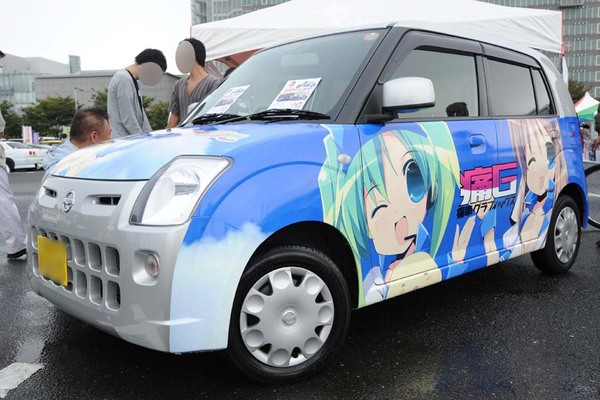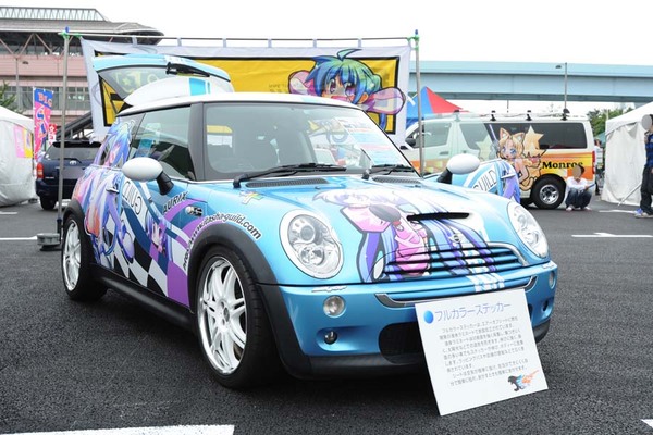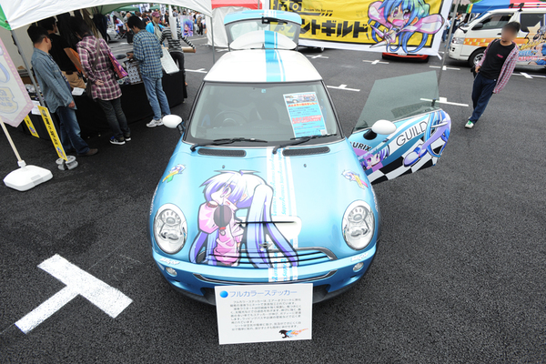BMW・ミニ クーパーSに自社のキャラクターをライドオンさせていたのは痛車プリントギルド。ベース車の青色とキャラのバランスが良く、白と水色の反転ラインを入れるなど、今回の出展企業の痛車のなかで個人的にお気に入りの一台。