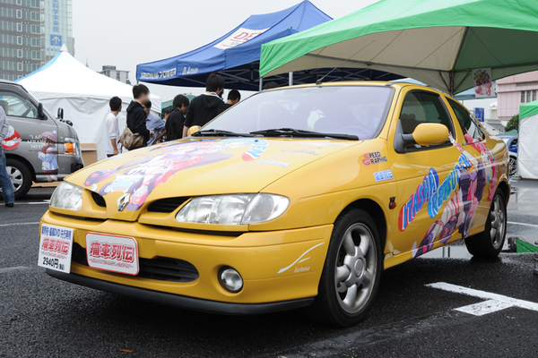 11月4日に発売を迎える、痛車のみで構成された映像作品「痛車列伝」のブース。アニメーター渡辺明夫としても知られる、ぽよよんろっく氏が手がけたイメージキャラクターをルノー・メガーヌクーペにあしらっていた。