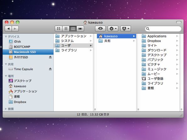 | ピクチャ | iPhotoのライブラリーやPhoto Boothの写真、ScanSnapで取り込んだ画像など |
