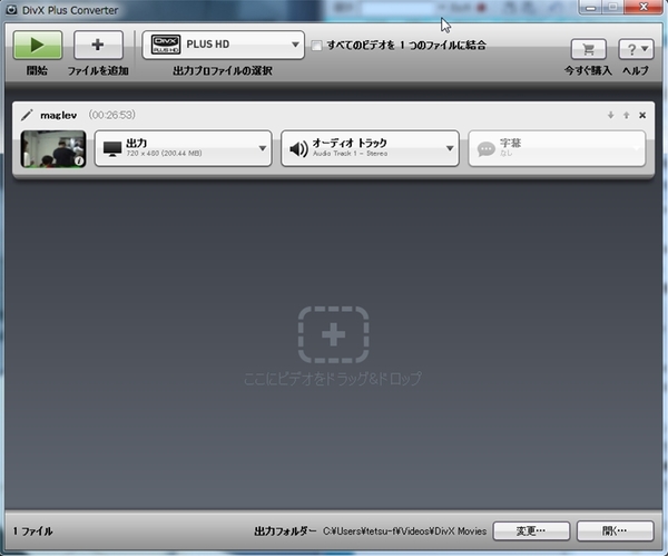 また、DivX Plus Converterはビデオをドラッグ&ドロップするだけで、DivX形式に変換できます。でも一番の魅力は、ハイビジョン映像をMKV+H.264に手軽に変換できるところでしょう。MKV+H.264への変換は無償なんですから(笑)。