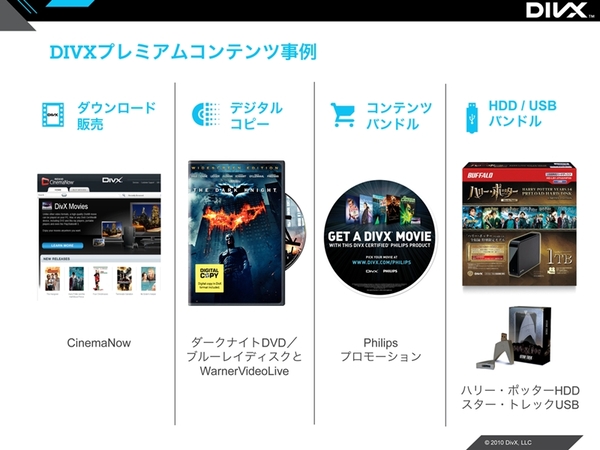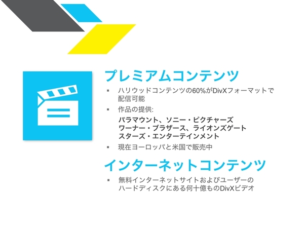 海外では日常的に行なわれている映画のダウンロード配信。ハリウッド映画作品のほぼ6割がDivX形式で提供可能となっており、自宅にいながらにしてDivXプラットフォームで高品位の映画を楽しめる。