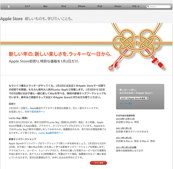 2011年の内容は、アップルによれば「Apple Storeが厳選したApple製品、アクセサリ、オリジナルグッズなどが入っています」とのこと。キーワード的にはiPodや音楽関連の単語が入っていないのが気にかかるが、実は初売りを告知するページには、iPodのDockケーブルとイヤホンが絡められた"水引"風イラストが掲載されている。やはりiPodが入ってくるのは、かなり確度が高いと思われる。