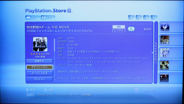 それでも、PSストアを押さえておきたいのは、時々ツボを突いた作品を用意しているからだ。例えば、Apple TVにはなかった「特攻野郎Aチーム THE MOVIE」の日本語字幕版がHD版で用意されている。600円と安くはないが、作品があるのとないのでは大違いである。