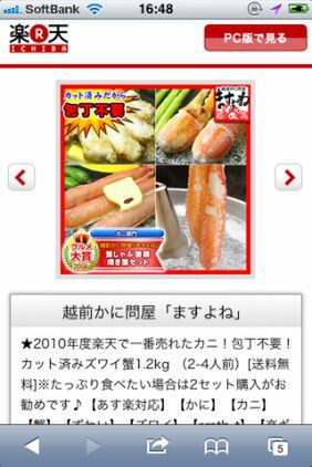 ショッピングモール最大手「楽天市場」でも、スマートフォンへの対応が進んでいる。大きなアイコンとリスト、JavaScriptによるスライドパネルやタブパネルを駆使したトップページは見栄えもよく、使い勝手もいい。PCサイトでは店ごとにバラバラで見づらい個別商品ページも、スマートフォンサイトではシンプルに見やすく整理されている。