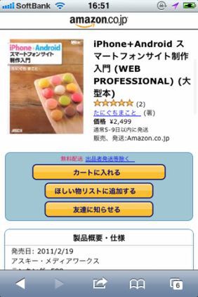 Amazon.co.jpのスマートフォンサイト。ユーザーが商品を検索して使うことに特化しており、装飾要素を極力排除シンプルなデザインは楽天とは対象的だ。検索結果や個別商品ページでは、JavaScriptを使った折りたたみパネルを採用し、縦に長くなりがちなスマートフォンサイトをすっきり見せている。