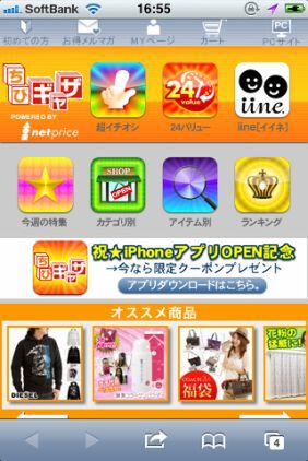 ネットプライスが運営する共同購入サイト「ちびギャザ」のスマートフォンサイトは、カラフルでにぎやかなトップページが目を惹く。ヘッダーにiPhoneアプリ風のナビゲーションアイコンを置き、カテゴリートップやカートなどにすぐに移動できるようにしている。ケータイサイトを一部流用しているため、デザインはやや統一感に欠ける。
