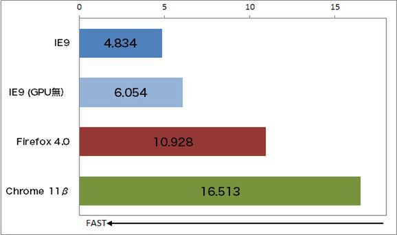 ただしFirefox 4.0は744秒で、Chrome 11βは898秒。いずれもIE9のGPUアクセラレーションなしに比べると、50%ほど速い。IE9のGPUアクセラレーションなしが遅すぎるのかもしれない。Firefox 4.0は一部でDirectWriteを使用しているはずだが、IE9ほどサポートは充実していないし、性能もそれほど引き出せていないようだ。