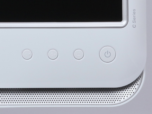 Lenovo C205のディスプレー上部にはウェブカメラとマイクが埋め込まれている。カメラのすぐ横にある小さな穴は、室内の明るさを測る「測光センサー」のようだ。電源を入れると光る。ソフトで自動調整機能を有効にしておくと、部屋の明るさに合わせてディスプレー輝度が自動調整される。寝室など間接照明の部屋に置く際にも便利だろう。