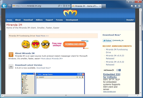 現在、インスタントメッセージを提供しているサービスはYahoo!やWindows Live、AIMなど数多くある。これらのアカウントを一元管理してメッセージ交換を楽しめるのがMiranda IMである。複数プロトコルに対応しているので、複数サービスの同時通信が可能で、ファイル送信や会話への招待もサポートしている。インストール時は必要最小限の機能となっているが、プラグインを追加することでSkypeのプロトコルに対応したり、インターフェースやスキンをカスタマイズできる。