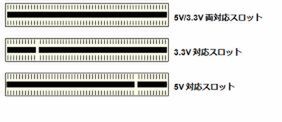まずスロットの方は図1のようになっており、マザーボードがどちらの信号を扱えるかで形状が異なっている。これに対応する拡張カード側のカードエッジも図2のようになっている。実際筆者が所有していた当時の拡張カードを調べてみると、5V専用カードと両対応カードが結構入り乱れている。大雑把に言えば、2000年頃までのカードは圧倒的に5Vのみのものが多いが、それを過ぎると両対応製品がかなり多くなってきている。