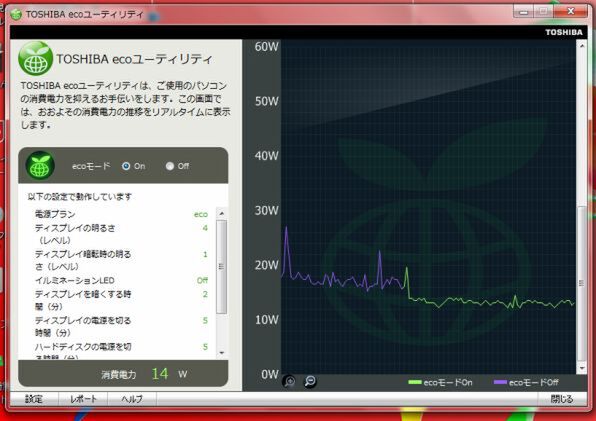 TOSHIBA ecoユーティリティ自体では変更できないものの、画面上で現時点での消費電力が数値とグラフで明示されるので、節電に貢献しているという実感は得られやすい。また、1週間以上ecoモードで運用すると、そのログからCO2削減状況も把握できる。