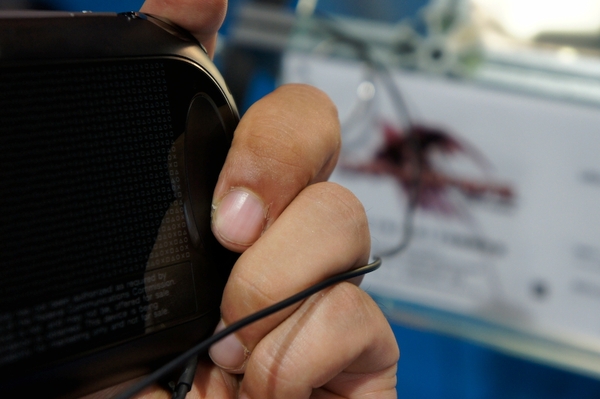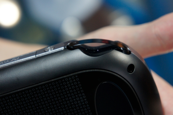 さて、背面タッチの反応も上々。スマホで慣れている人ならば、その感覚で操作できるだろう。どちらかというと、ドリクラの流れではないが「目隠し」状態で操作している感覚だった。ちょっと苦戦したのだが、コツとしては背面左右にあるくぼみに小指をかけておいて、そこと人差し指や中指の距離でなんとなく把握するというのがいいだろう。ギャルゲーで頭の後ろを撫でるだとか、アーマードコアのようなボタンフル活用ゲームでの新しい難解操作にもつながるのではないだろうか。実は文字入力機能で背面タッチパッドを使うのかと思っていた。母音を背面で押してというようなローマ字入力。カンファレンスのPVを見る限り、QWERTYソフトウェアキーボードのようなので残念。