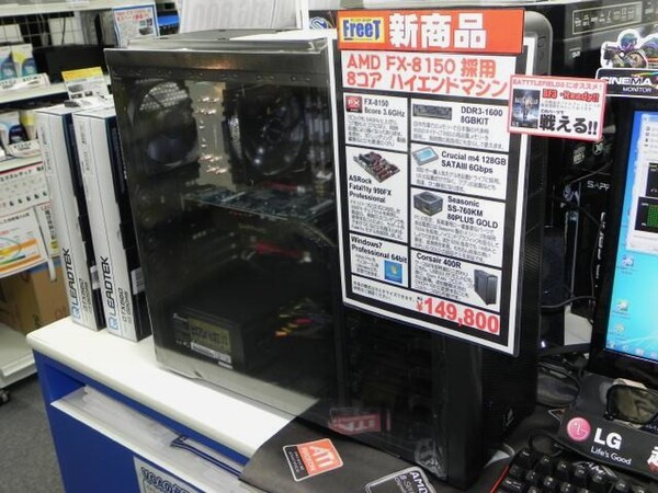 一方のPC DIY SHOP FreeTの即納モデルは「AMD FX-8150採用 8コア ハイエンドマシン」(仮称)で価格は14万9800円。基本スペックはマザーボードにAMD 990FX搭載のASRock製「Fatal1ty 990FX Professional」、ビデオカードにSapphire製の「Radeon HD 6950」、8GBのDDR3メモリー、SSDにCrucial「m4 128GB」、760W電源(GOLD認証)、DVDマルチドライブなど。(上記の構成からカスタマイズも可能とのこと)