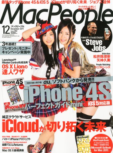 「Mac People 2011年12月号 」の表紙は、SKE48の松井珠理奈さんと矢神久美さん。特別定価890円で、カラー128ページの別冊付録小冊子1「iPhone 4Sパーフェクトガイドmini」と、カラー64ページの特別付録小冊子2「MacPeople Basic: Microsoft Outlook for Mac 2011」が付属する。巻頭1「ポスト・スティーブ」、特集1「そろそろ本気でクラウドサービス」をはじめ、今月ももりだくさん |