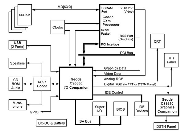 Elanシリーズとは異なり、完全な1チップ化は実現できず、CPUにグラフィックとメモリーコントローラー、PCIコントローラーを搭載した「Geode GX」に、「CS55xx」シリーズのI/OコンパニオンチップをPCI経由でぶらさげるという構成になっている。