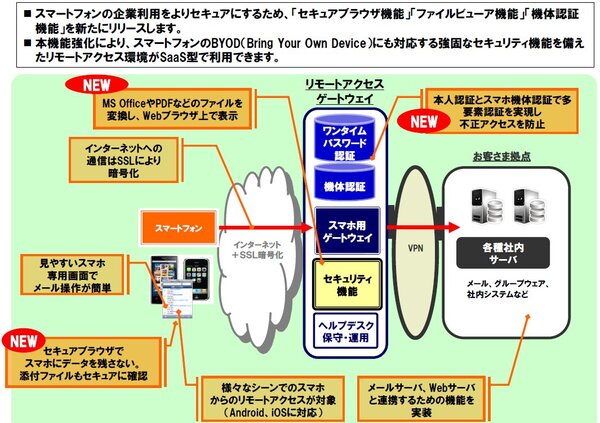 提供するのは、基本メニューの「セキュアブラウザ機能」と「ファイルビューア機能」、有料オプションの「機体認証機能」の3機能。セキュアブラウザは、コンテンツのキャッシュやアクセス履歴などのデータを残さないでメールの添付ファイルや社内システムにリンクされたコンテンツファイルを閲覧できるスマートフォン向けブラウザである。