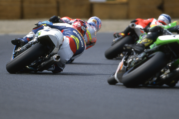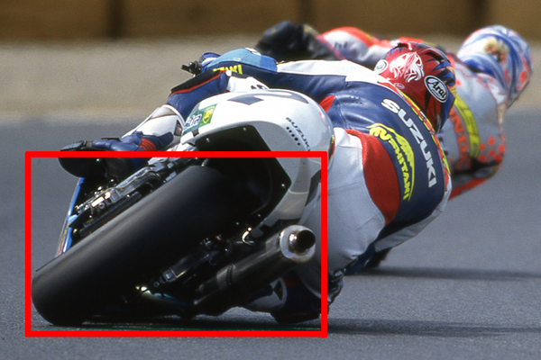 写真左手前のライダースーツに注目してほしい。原色寄りのデザインだが、微妙なグラデーションもしっかりと再現されている。そのほかのライダーについても、ぼやけた状態でも階調は維持されているし、色飛びもない。右の写真は、左の写真をトリミングしたもの。タイヤや金属パーツ部分の階調の豊富さをチェック