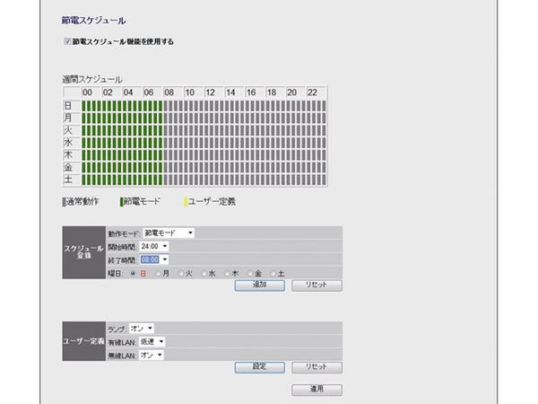パソコンとゲーム機やテレビなどでは、セキュリティーの設定が異なる。そんな場合でもマルチSSIDに対応しているから、各々違う設定で同時利用が可能だ。また、時間帯で電波出力を落としたり有線・無線のオンオフを設定可能。うまく利用すれば節電につながる。