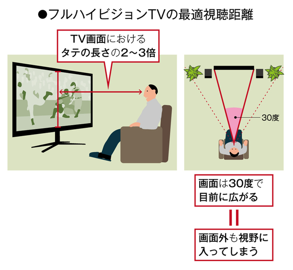 現在の薄型テレビはブラウン管テレビのようなインターレース走査ではないので、60Hzで生じるフリッカー(画面のチラツキ)の問題は生じない。LEDバックライトのスキャニングも120Hz以上の短いタイミングなので、人間はそのチラツキを認識できない。「テレビから離れて見ましょう」というのは、ブラウン管時代(5~7Hが最適視聴距離)の古い常識と考えていい。もちろん、近すぎる(1Hより短い)のはNGだが。
