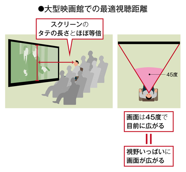 ところが、45度前後になると、視野のほとんどを映像が埋め尽くし、画面の外が目に入りにくい状態になる。当然、映像への集中度が高まる。なお、この45度は、大型スクリーン(300~500インチ)を使う映画館のベストポジションで見た場合の数値とほぼ同じ。映画館で見ると臨場感がまるで違うように感じるロジックの1つがこの「視野のカバー率」だ。