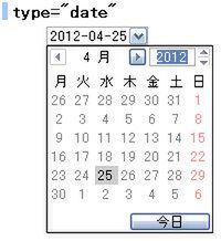「date」を指定すると、フォームパーツは年月日の入力欄になります。対応しているブラウザーでは年月日を入力するコントロールが表示されます。Operaでは、datetimeと同じ系統のカレンダー型コントロールが利用できます。