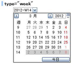 weekの値は西暦と週の組み合わせで構成されます。たとえば、「2012-W04」は2012年の4週目、「2099-W34」は2099年の34週目という意味です。min属性やmax属性、step属性も指定できます。